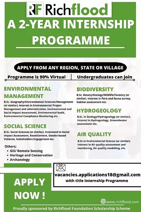 This is an Internship program for junior scientists in any region, state or village in Africa looking to build capacity and become specialists in their field of study. To join the ongoing sponsored Richflood internship programme send your application (Application letter and attach resume). You will receive a response to your application with further instructions.